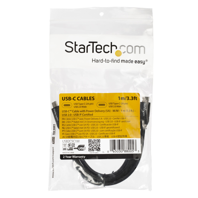 StarTech.com Cable USB-C a USB-C de 1 metro con capacidad para Entrega de Alimentación de 5 amperios, compatible con USB 2.0. SKU: USB2C5C1M