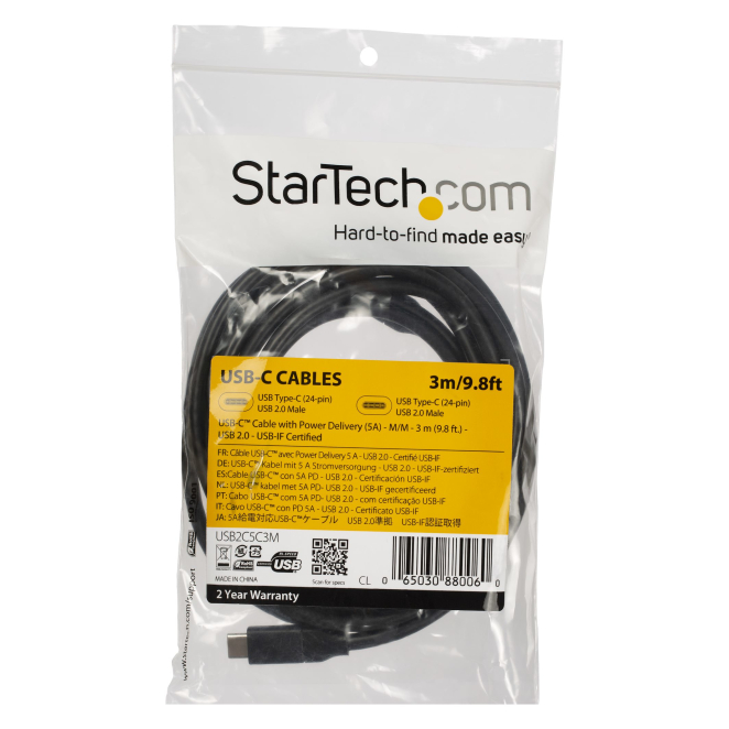 StarTech.com Cable de 3 metros USB-C a USB-C con capacidad para Entrega de Alimentación de 5A – USB TipoC – Cable de Carga USBC – USB 2.0, SKU USB2C5C3M. Ideal para una carga rápida y eficiente.