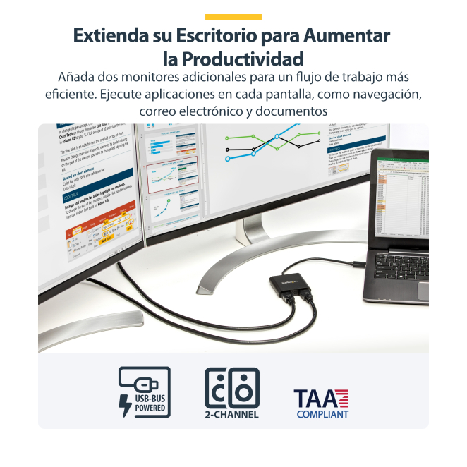 El StarTech.com Adaptador USB 3.0 a HDMI Doble – 4K 30Hz trae consigo múltiples beneficios. Empezando con su capacidad de soportar hasta dos pantallas HDMI, con una resolución máxima de 4K en uno de los puertos. Además, el adaptador permite ampliar o reflejar tu pantalla principal, lo que es ideal para trabajos que necesitan amplio espacio de visualización. Este adaptador también es perfecto para aplicaciones de negocios, gracias al gran ancho de banda de su interfaz USB 3.0, asegurando una experiencia fluida y eficiente.