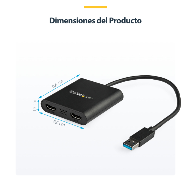 Sí, el StarTech.com Adaptador USB 3.0 a HDMI Doble – 4K 30Hz soporta resoluciones de hasta 4K a 30Hz en uno de sus puertos HDMI. Puedes conectar hasta dos pantallas HDMI independientes utilizando el StarTech.com Adaptador USB 3.0 a HDMI Doble – 4K 30Hz. Sí, el adaptador es compatible con sistemas operativos Windows. La compatibilidad con Mac puede variar, por lo que se recomienda consultar el soporte técnico de StarTech. No, el StarTech.com Adaptador USB 3.0 a HDMI Doble – 4K 30Hz tiene una configuración plug-and-play que no requiere software adicional. Sí, el adaptador soporta la transmisión de audio a través de sus puertos HDMI. Color del producto Negro Formatos gráficos soportados 1024 x 768 (XGA), 1280 x 1024 (SXGA), 1280 x 720 (HD 720), 1280 x 768 (WXGA), 1280 x 800, 1366 x 768, 1400 x 1050 (SXGA+), 1600 x 1200 (UXGA), 1680 x 1050 (WSXGA+), 1920 x 1080 (HD 1080), 1920 x 1200 (WUXGA), 2048 x 1152, 3840 x 2160, 640 x 480 (VGA), 800 x 600 (SVGA) Circuito integrado Trigger T6-688SL, Silicon Image - Sil9136-3 Certificados de conformidad CE, RoHS Intervalo de temperatura operativa 0-40 °C Intervalo de temperatura de almacenaje -20-75 °C Intervalo de humedad relativa para funcionamiento 0-85 % Ancho 66 mm Profundidad 315 mm Altura 15 mm Peso 56 g Ancho del paquete 144 mm Profundidad del paquete 207 mm Altura del paquete 38 mm Peso del paquete 184 g