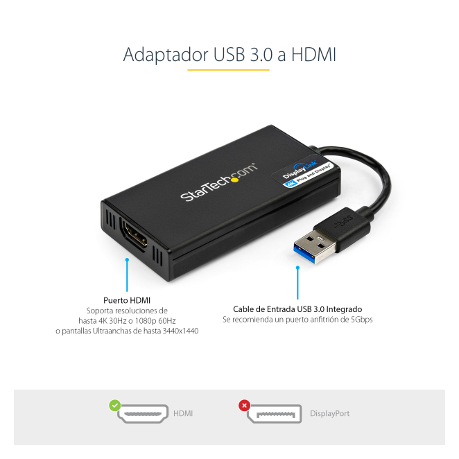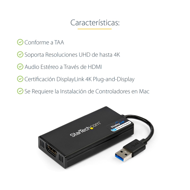 Con tantas opciones en el mercado, elegir el StarTech.com Adaptador Gráfico Externo USB 3.0 a HDMI es una decisión inteligente por varias razones: Disfrute de la mejor calidad de imagen y sonido con capacidad para resoluciones UltraHD 4K a 30Hz. Instalación rápida y sin complicaciones en múltiples sistemas operativos incluyendo Windows, Mac, Chrome OS y Linux. Portátil y fácil de llevar, perfecto para profesionales en movimiento. Configuración sencilla con instalación automática de software controlador más reciente. Perfecto para ser usado con dispositivos y pantallas que aún no soportan 4K.