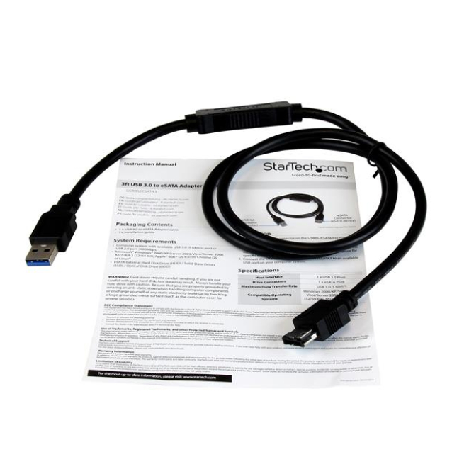 A continuación se presentan algunas preguntas comunes sobre el StarTech.com Cable de 91cm Adaptador USB 3.0 a eSATA. Sí, el StarTech.com Cable de 91cm Adaptador USB 3.0 a eSATA es compatible con todas las versiones actuales de Windows y macOS, gracias a su diseño Plug and Play. No, el StarTech.com Cable de 91cm Adaptador USB 3.0 a eSATA no requiere la instalación de software adicional. Es un dispositivo Plug and Play. Sí, el adaptador ha sido probado y es compatible con discos duros externos de hasta 4TB de capacidad. Sí, este adaptador es compatible con unidades ATAPI de Blu-ray, así como con DVD y CD. El StarTech.com Cable de 91cm Adaptador USB 3.0 a eSATA tiene una longitud total de 91 cm (0.91 metros). Color del producto Negro Longitud de cable 0.9 m Conector 1 USB A Género del conector 1 Macho Género del conector 2 Hembra Certificados de conformidad RoHS Certificación CE, FCC Conectar y usar (Plug and Play) Sí Intervalo de temperatura operativa 0-60 °C Intervalo de temperatura de almacenaje -10-70 °C Ancho 24 mm Profundidad 910 mm Altura 10 mm Peso 67.5 g Manual de usuario Sí Ancho del paquete 198 mm Profundidad del paquete 218 mm Altura del paquete 15 mm Peso del paquete 80 g