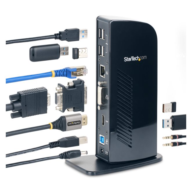 La StarTech.com Docking Station USB 3.0 ofrece una amplia gama de beneficios, desde la expansión de tu configuración de pantalla hasta mejoras en conectividad. Esta estación de acoplamiento es compatible con una multitud de dispositivos, asegurando la integración en cualquier entorno de trabajo. La resolución máxima de 1920x1200p y el hub USB integrado proporcionan una productividad y versatilidad insuperables. Esta Docking Station no solo permite la conexión de múltiples monitores, sino que también facilita el trabajo con redes cableadas gracias a su puerto Ethernet integrado. Además, incluye conectores de audio para una experiencia multimedia completa.