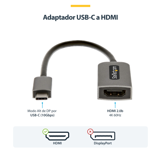 A continuación, algunas preguntas frecuentes sobre el StarTech.com Adaptador USB C a HDMI de Vídeo 4K 60Hz – HDR10: El adaptador es compatible con dispositivos USB-C que soportan el modo Alt de DisplayPort y Thunderbolt 3. Sí, el adaptador soporta canales de salida de audio 2.0 para una experiencia multimedia completa. No, el adaptador no requiere software adicional. Es un dispositivo plug-and-play que funciona de inmediato. Sí, el adaptador es compatible con versiones anteriores de HDMI, permitiendo su uso con monitores más antiguos a sus resoluciones máximas admitidas. Sí, este adaptador es perfectamente compatible con MacBooks y otros laptops con puertos USB-C o Thunderbolt 3. Color del producto Gris Factor de forma del conector USB Derecho Formatos gráficos soportados 3840 x 2160, 4096 x 2160 HDCP Sí Circuito integrado ANX7517 Certificados de conformidad CE, RoHS Intervalo de temperatura operativa 5-35 °C Intervalo de temperatura de almacenaje -20-60 °C Intervalo de humedad relativa para funcionamiento 25-60 % Profundidad 44 mm Altura 10.5 mm Peso 16 g Ancho del paquete 125 mm Profundidad del paquete 225 mm Altura del paquete 15 mm Peso del paquete 22 g