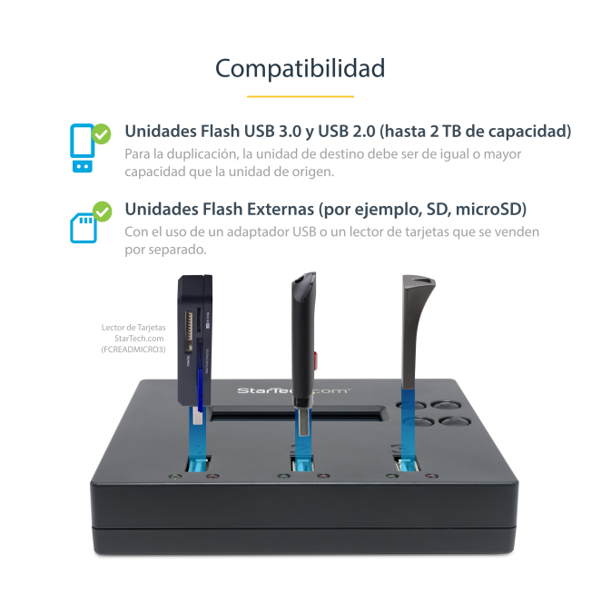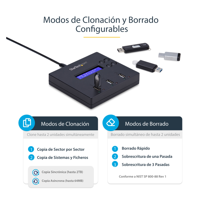 StarTech.com clonador autónomo 1:2 para memorias USB, copiador de unidades de memoria USB, copia sector por sector de 1,5 GB/min, borrado de 3 pasos, SKU USBDUP12 Stock disponible en nuestros almacenes Financiado desde: 9,11 € /mes Solicita información en caso de necesitar envío urgente. Métodos de pago: StarTech.com Clonador Autónomo 1:2 para Memorias USB – Copiador de unidades de memoria USB El StarTech.com Clonador Autónomo 1:2 para Memorias USB es una herramienta eficiente y versátil diseñada para clonar y borrar unidades USB sin necesidad de un ordenador anfitrión. Este clonador de alta velocidad permite copiar datos mediante una duplicación sector por sector a una velocidad de hasta 1,5 GB/min, asegurando una replicación precisa del sistema y los ficheros almacenados. Además, ofrece un borrado seguro con tres modos diferentes que cumplen con las normas del NIST para garantizar una eliminación completa de todos los datos. Incluye una pantalla LCD y botones de acceso rápido para facilitar su uso. El StarTech.com Clonador Autónomo 1:2 ofrece múltiples ventajas que lo hacen ideal para usuarios que requieren duplicar y borrar datos en unidades USB con rapidez y precisión. Sus principales beneficios incluyen: