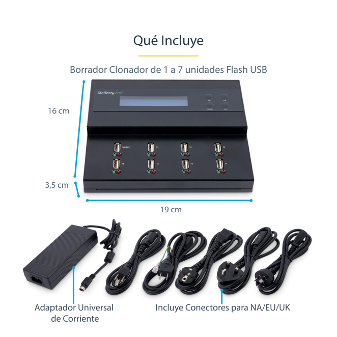A continuación, algunas preguntas frecuentes sobre el StarTech.com Clonador Autónomo 1:7 para Memorias USB: El StarTech.com Clonador Autónomo 1:7 para Memorias USB es compatible con memorias USB 3.0, USB 2.0 y USB 1.1, proporcionando una amplia versatilidad. El clonador ofrece una velocidad de transferencia de hasta 1.5 GB/min, lo que garantiza una duplicación rápida y eficiente. No, el StarTech.com Clonador Autónomo 1:7 para Memorias USB es completamente autónomo y no requiere un ordenador para su funcionamiento. El clonador incluye tres modos de borrado: borrado rápido, borrado de una pasada y borrado de varias pasadas (cumple con las normas del Departamento de Defensa). Puede clonar hasta siete unidades USB de forma simultánea con el StarTech.com Clonador Autónomo 1:7 para Memorias USB. Interfaz USB 2.0 Color del producto Negro Conectar y usar (Plug and Play) Sí Indicadores LED Actividad, Fallo Certificación CE, FCC, TAA, REACH Intervalo de temperatura operativa 5-45 °C Intervalo de temperatura de almacenaje -20-85 °C Intervalo de humedad relativa para funcionamiento 20-80 % Peso 1100 g Ancho del paquete 235 mm Profundidad del paquete 445 mm Altura del paquete 85 mm Peso del paquete 3000 g Certificados de conformidad RoHS