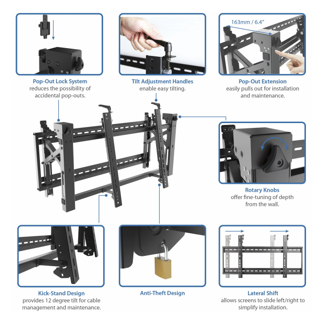 La experiencia de usuario con el StarTech.com Soporte VESA de Montaje de Video Wall es impecable. Su diseño desplegable permite acceder fácilmente a la parte trasera de la pantalla, haciendo que ajustes y mantenimiento sean tareas sencillas. Los seis puntos de microajuste garantizan una alineación precisa en todos los ángulos, mientras que el material de alta calidad asegura una instalación segura y robusta. Adicionalmente, la función antirrobo brinda una capa extra de seguridad, ideal para entornos públicos.