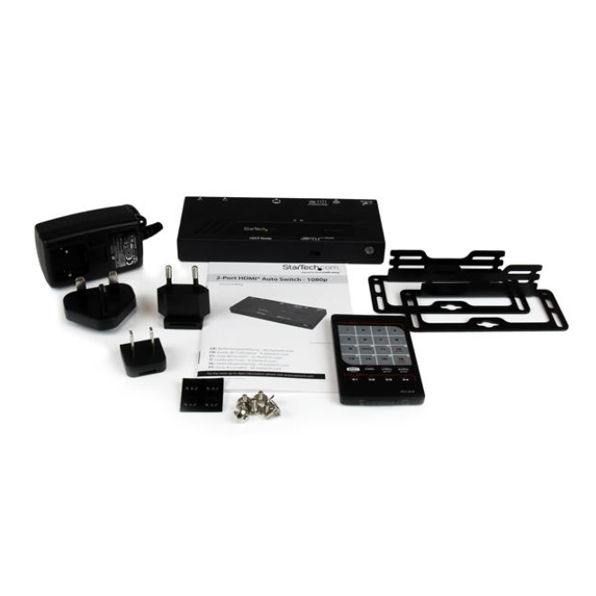 Estas son algunas de las preguntas más comunes sobre el StarTech.com Switch HDMI de 2 Puertos con Conmutado Automático y Prioritario – 1080p: Este Switch HDMI soporta resoluciones de hasta 1080p, garantizando la máxima calidad de imagen para todas tus fuentes de vídeo. No, el StarTech.com Switch HDMI de 2 Puertos es plug and play, por lo que no se requiere software adicional para su funcionamiento. No, este modelo específico no está diseñado para montaje en rack. El switch seleccionará automáticamente la última fuente de vídeo activada, facilitando una transición sin fallos entre dispositivos. Está fabricado en una combinación de aluminio y plástico, proporcionando durabilidad y resistencia. Sí, el StarTech.com Switch HDMI de 2 Puertos es compatible con cualquier dispositivo que tenga un puerto HDMI, independientemente de la marca. Montaje en rack No Color del producto Negro Indicadores LED Si Consumo energético 18 W Voltaje de entrada AC 100 - 240 V Tipo de enchufe Tipo M Intervalo de temperatura operativa 0-40 °C Intervalo de temperatura de almacenaje -20-60 °C Intervalo de humedad relativa para funcionamiento 0-80 % Ancho 65 mm Peso 290 g Profundidad 156 mm Altura 20 mm Manual de usuario Sí Ancho del paquete 197 mm Profundidad del paquete 294 mm Altura del paquete 72 mm Peso del paquete 853 g Certificación CE, FCC, TAA, REACH Certificados de conformidad RoHS