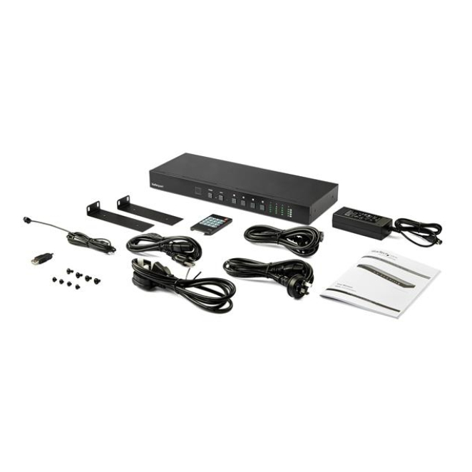 A continuación se responden algunas de las preguntas más comunes sobre el StarTech.com Switch Multiplicador de Vídeo HDMI Matriz de 4×4. Sí, el StarTech.com Switch Multiplicador de Vídeo HDMI Matriz de 4×4 es retrocompatible con versiones anteriores de HDMI. Sí, viene con un mando a distancia y extensor IR para control sin necesidad de estar cerca del dispositivo. Sí, el conmutador incluye los soportes necesarios para su montaje en rack. El StarTech.com Switch Multiplicador de Vídeo HDMI Matriz de 4×4 soporta resoluciones de hasta 4096 x 2160 a 60Hz. Se pueden conectar cualquier dispositivo con salida HDMI, incluyendo ordenadores, reproductores de Blu-ray, consolas de juegos y más. Montaje en rack Sí Material de la carcasa Metal Indicadores LED Actividad, Poder Corriente de entrada 1.5 A Voltaje de entrada AC 100 - 240 V Intervalo de temperatura operativa 0-40 °C Intervalo de temperatura de almacenaje -20-60 °C Intervalo de humedad relativa para funcionamiento 20-90 % Ancho 160 mm Peso 2000 g Profundidad 437 mm Altura 43 mm Soportes de montaje incluidos Sí Manual de usuario Sí Ancho del paquete 292 mm Profundidad del paquete 525 mm Altura del paquete 95 mm Peso del paquete 4000 g Certificación TAA, CE, FCC, REACH Certificados de conformidad RoHS