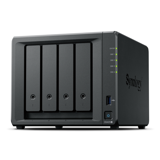 El Synology DS425+ admite hasta 80 TB de almacenamiento, distribuidos en hasta cuatro unidades de disco duro o SSD.