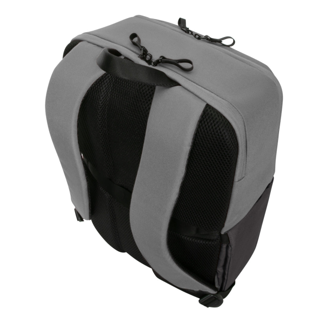 Mochila Targus Sagano de 15.6 pulgadas en colores negro y gris, modelo TBB634GL, diseñada para portátiles y con características ergonómicas.