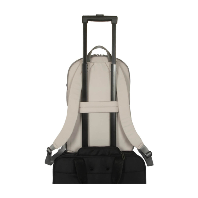 Definitivamente. La Targus TBB65013GL incluye características útiles para viajeros, como el bolsillo oculto en la parte trasera y la compatibilidad con maletas rodantes gracias a su correa para equipaje.