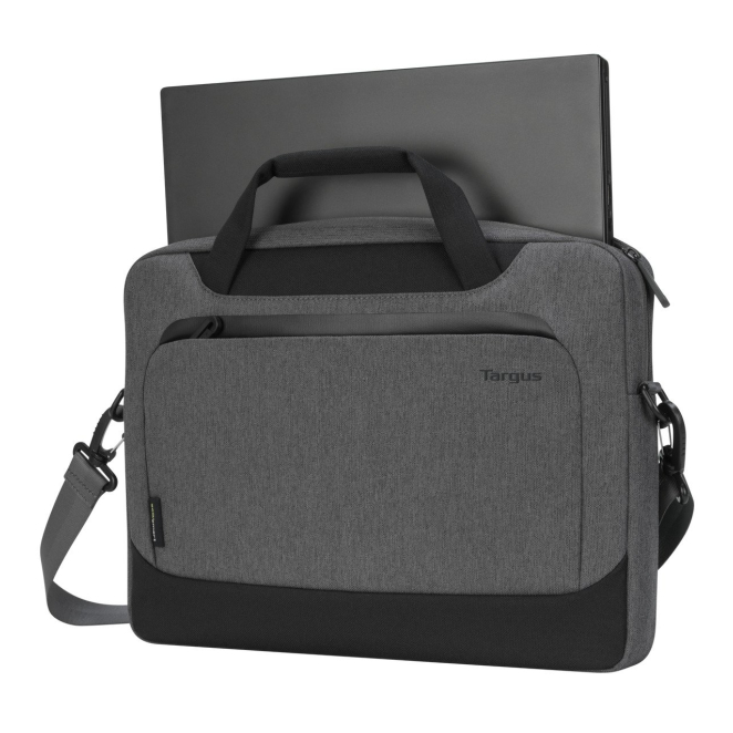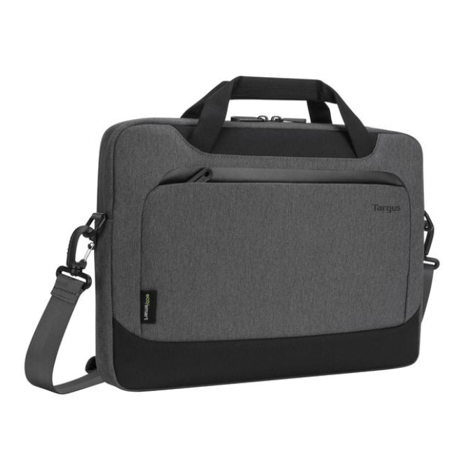 Maletín gris Targus Cypress EcoSmart para portátiles de 14 pulgadas. Modelo SKU TBS92602GL, fabricado parcialmente con materiales reciclados.