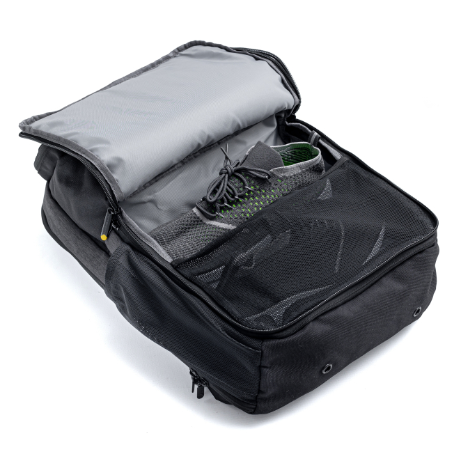 La mochila cuenta con 2 compartimentos principales y varios bolsillos adicionales para organización.