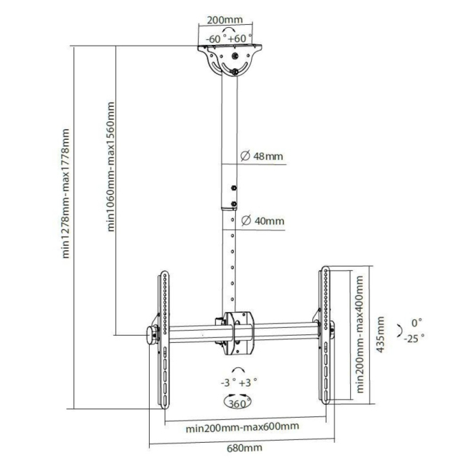 El soporte ofrece un ángulo de inclinación de -25° a 0° y un ángulo de giro de 180°.