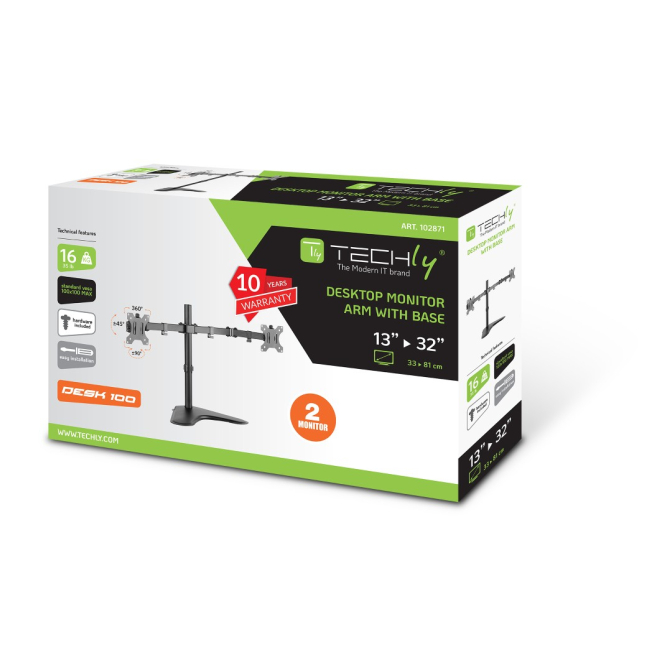 El Techly ICA-LCD 2524 soporte para monitor ofrece múltiples ventajas que lo convierten en una opción destacada. Su capacidad de rotación de 360 grados y su ángulo de inclinación de -45 a 45 grados permiten una flexibilidad total, adaptándose a cualquier posición deseada. Además, su montaje mediante tornillos garantiza una instalación segura y estable. El soporte es compatible con interfaces de montaje de 75 x 75 mm a 100 x 100 mm, lo que lo hace adaptable a una amplia variedad de monitores. Ideal para los que buscan un soporte ajustable para monitor, este producto proporciona una experiencia ergonómica mejorada.