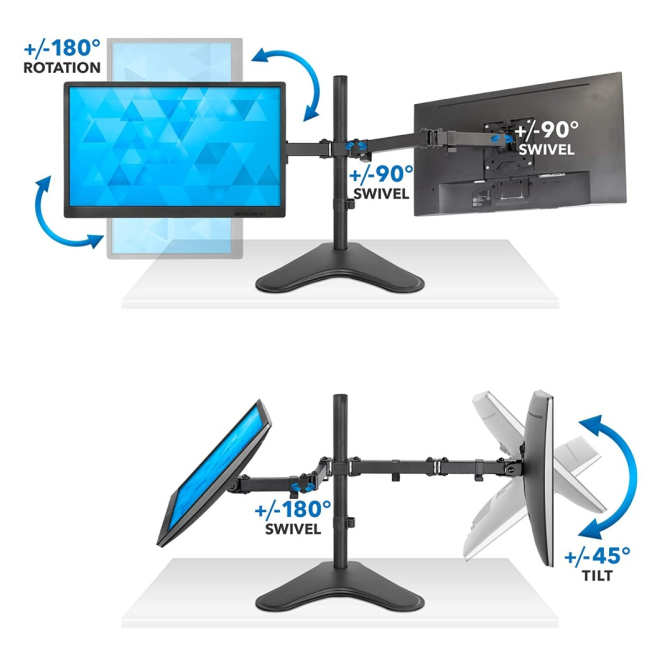 Con ángulos de inclinación de -45 a 45 grados, rotación de 360 grados y giro de -90 a 90 grados, puedes adaptar el monitor a cualquier posición deseada.