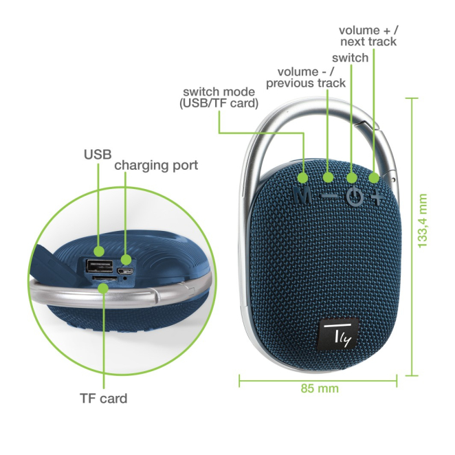 El altavoz monofónico portátil Techly ICASBL321BL está diseñado para usuarios que buscan un dispositivo compacto pero potente para disfrutar de música en cualquier lugar. Es ideal para fiestas gracias a su diseño portable y fácil de emparejar. Los estudiantes y profesionales también encontrarán este altavoz útil para presentaciones o reuniones gracias a la calidad de su micrófono integrado. El Techly ICASBL321BL es perfecto para aquellos que valoran el rendimiento y la estética en un dispositivo compacto. Usar el Techly ICASBL321BL es una experiencia placentera gracias a su fácil configuración y emparejamiento rápido. La batería integrada brinda horas de música con solo 2 horas de carga. La tecnología Bluetooth 5.3 ofrece una conexión estable dentro de un rango de 10 metros, asegurando que la música nunca se detenga. Su tamaño compacto y el diseño esférico permiten un fácil transporte, mientras que la capacidad para leer tarjetas microSD añade un plus a su funcionalidad.