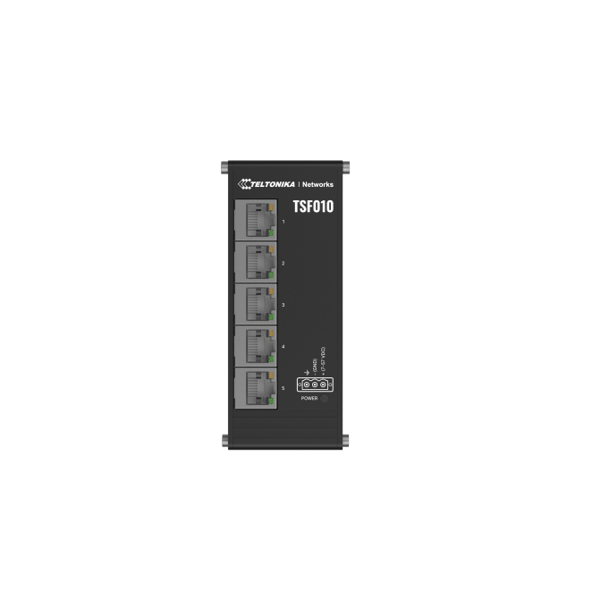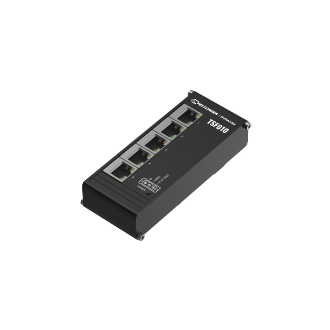 Teltonika NETWORKS TSF010, switch plano no administrado, Fast Ethernet 10/100, para montaje en riel DIN, color negro, SKU TSF010000000