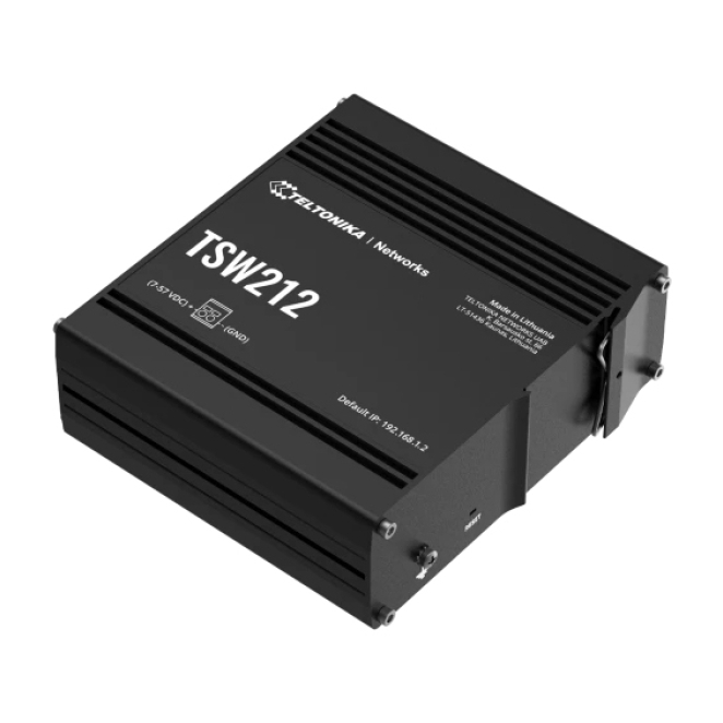 Switch gestionado Teltonika modelo TSW212 con capacidad L2, Gigabit Ethernet (10/100/1000), en color negro. SKU: TSW212000000.