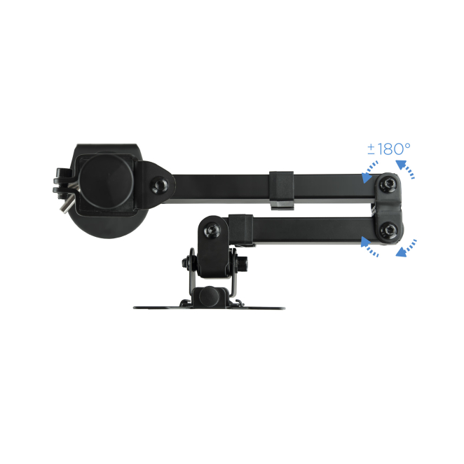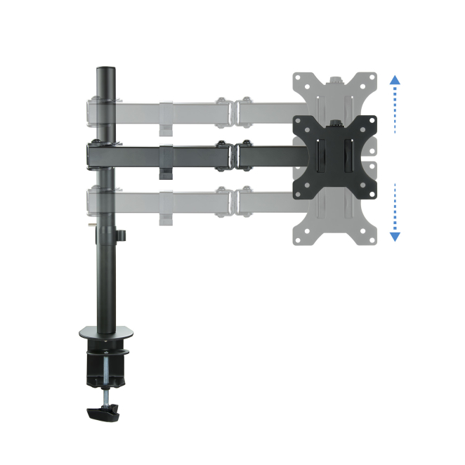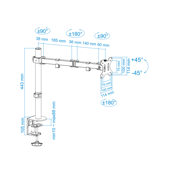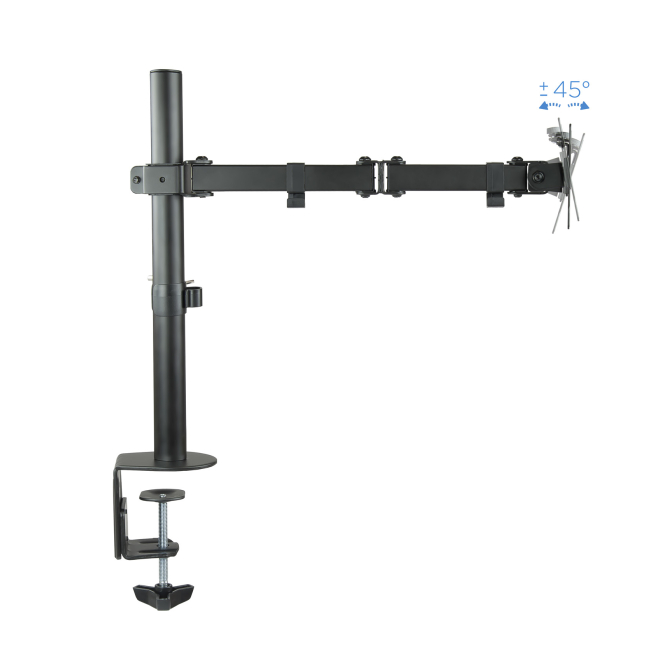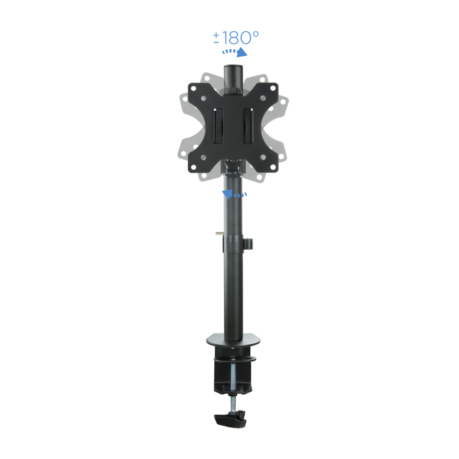 Este soporte para monitor permite ajustar la inclinación de -45° a +45°, el giro de -90° a +90° y la rotación de -180° a +180°. Además, puede ajustarse en altura hasta 443 mm y en profundidad hasta 459 mm.