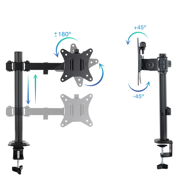 El TooQ Soporte de Mesa para 2 Pantallas 17″-27″, Negro permite ajustar la inclinación en un rango de -45° a 45° y la rotación en un rango de 180° de forma manual.