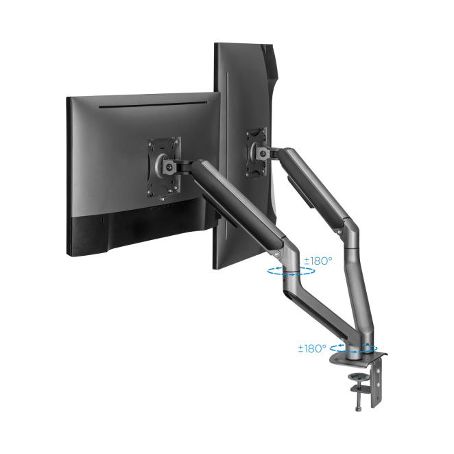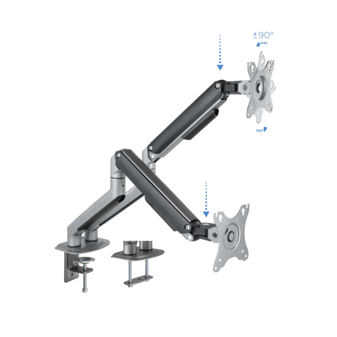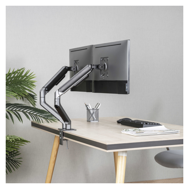 El manejo y ajuste del TooQ DB4132TNR-G es extremadamente sencillo gracias a su resorte de gas que permite un ajuste suave y sin esfuerzo. Los ángulos de inclinación y giro permiten personalizar cada monitor según las necesidades del usuario, garantizando una experiencia de visualización cómoda. Este soporte de monitor duradero cuenta con una extensión de brazo de hasta 428 mm, proporcionando flexibilidad máxima para cualquier configuración de pantalla dual. Además, el diseño robusto y la capacidad de peso de hasta 9 kg por pantalla aseguran una estabilidad firme, aumentando la productividad y la comodidad.