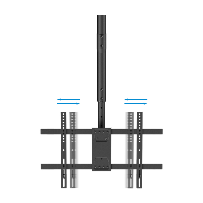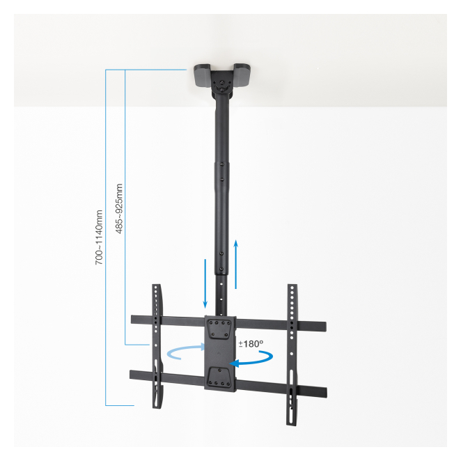 El TooQ Soporte de Techo para Pantallas 43”-86” asegura una usabilidad sencilla y intuitiva. Su sistema de ajuste manual permite configurar la altura entre 485 mm y 925 mm y ajustar la inclinación y el ángulo de giro con facilidad. La robustez del soporte garantiza una instalación segura de cualquier pantalla, mientras que la gestión de cables integrada mantiene todo ordenado. Todo esto contribuye a una experiencia de usuario óptima, sin complicaciones y con resultados profesionales.