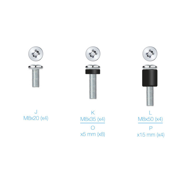 El kit incluye tornillos en varios tamaños: M4x12, M4x20, M5x12, M5x20, M5x30, M6x12, M6x20, M6x35, M8x12, M8x20, M8x35 y M8x50.