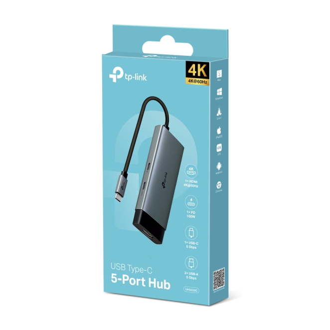 Descubre el TP-Link UH5020C hub de interfaz USB Tipo C 5000 Mbit/s Gris, diseñado para maximizar la conectividad y la productividad. Este dispositivo convierte un único puerto USB-C en cinco puertos altamente funcionales: un puerto HDMI con resolución 4K@60Hz, dos puertos de datos USB-A, un puerto de datos USB-C y un puerto de alimentación de 100W para carga rápida. Ideal para usuarios que necesitan múltiples conexiones en sus laptops y dispositivos móviles.