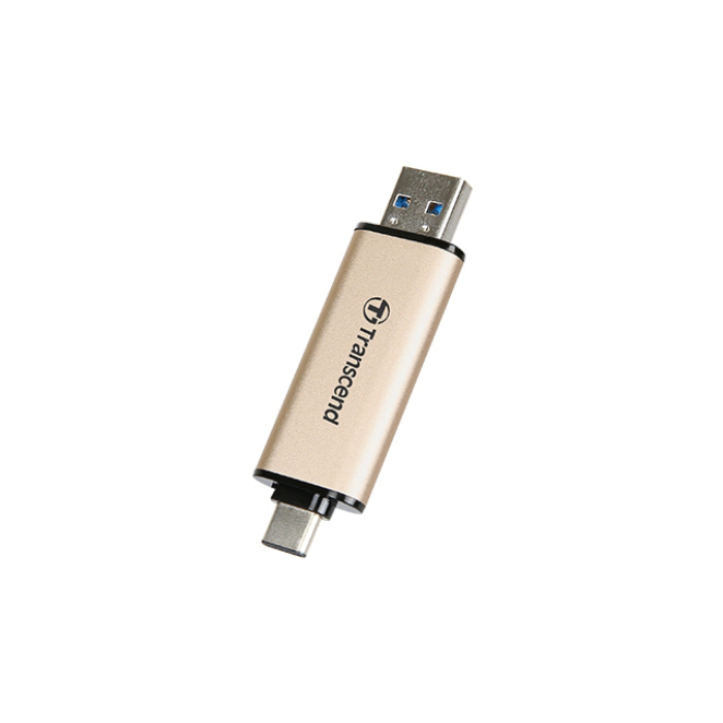 Imagen de la unidad flash USB Transcend JetFlash 930C con 256 GB de almacenamiento, conectores USB Type-A y USB Type-C, y acabado en oro. SKU: TS256GJF930C