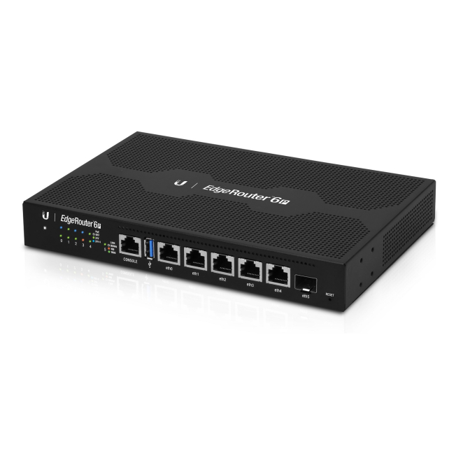 Router de Ubiquiti modelo EdgeRouter 6P con conectividad Gigabit Ethernet en un diseño negro. SKU ER-6P