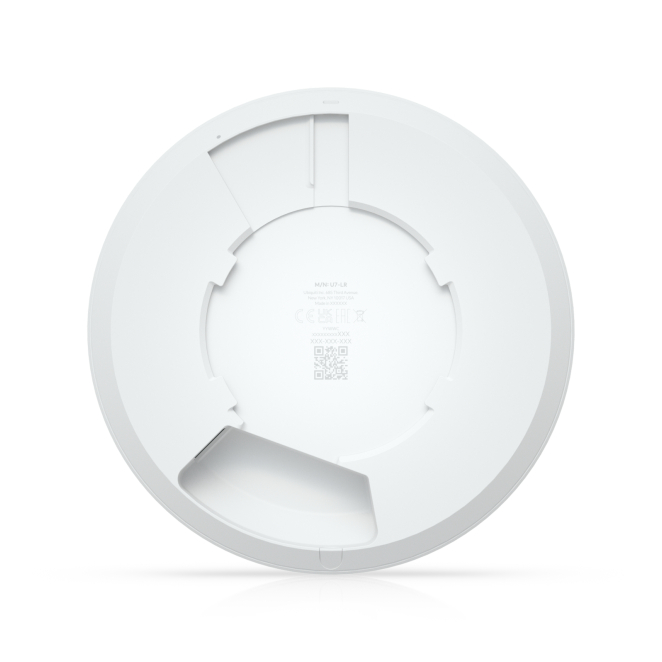 Punto de acceso Ubiquiti U7 Long-Range con velocidad de hasta 7300 Mbit/s en color blanco. Compatible con Energía sobre Ethernet (PoE). SKU U7-LR.