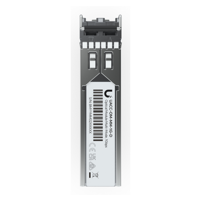 Transceptor de fibra óptica modelo Ubiquiti UACC-OM-MM-1G-D con velocidad de 1000 Mbit/s y conexión SFP.