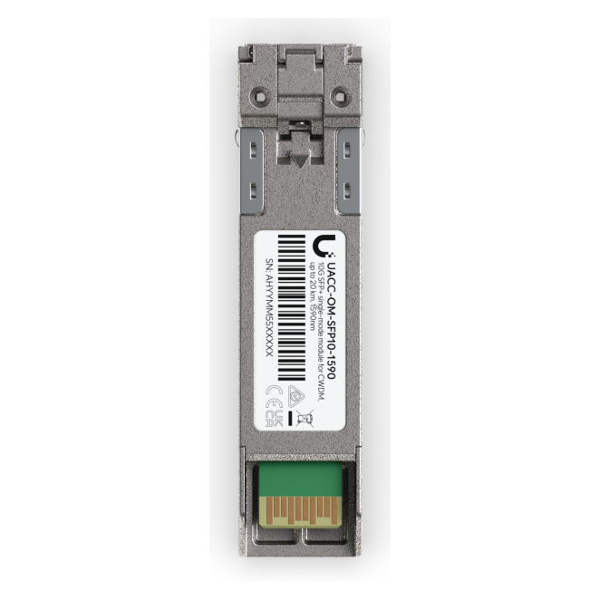 Módulo transceptor de fibra óptica Ubiquiti UACC-OM-SFP10-1590 con capacidad de 11300 Mbit/s y longitud de onda de 1590 nm.