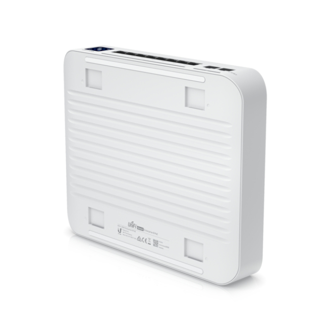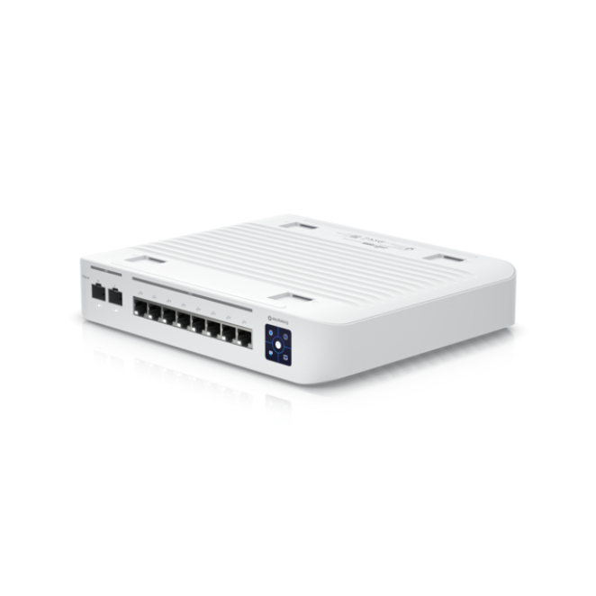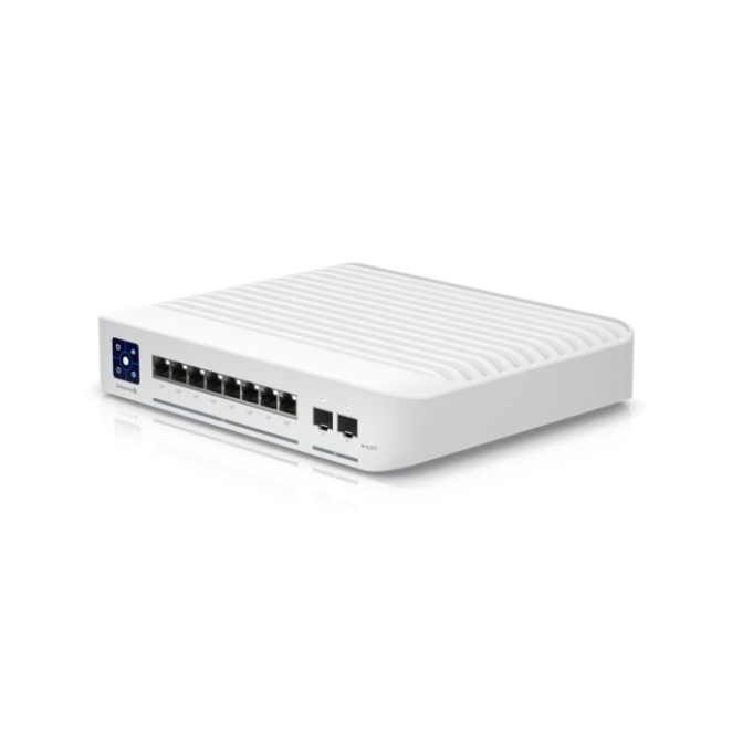 Vista del switch Ubiquiti UniFi Enterprise 8 PoE Gestionado L3 con 2.5G Ethernet y acero inoxidable, SKU USW-ENTERPRISE-8-POE