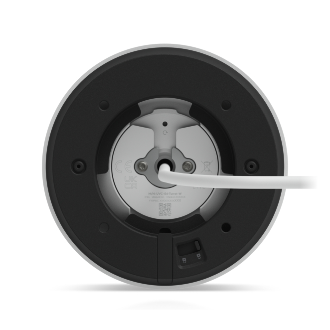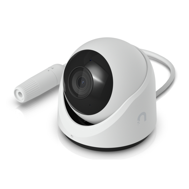 Imagen de la Ubiquiti G6 Turret, una cámara de seguridad IP para interior y exterior con resolución de 3864 x 2160 píxeles, compatible con montaje en techo o pared. SKU: UVC-G6-Turret-W