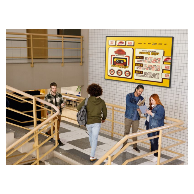 La pantalla está diseñada para ser utilizada en entornos comerciales como tiendas minoristas, restaurantes, salas de conferencia y espacios públicos, donde se necesite una señalización digital de alta calidad y versatilidad.