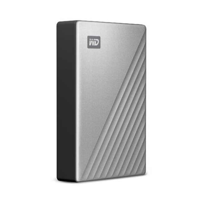 Disco duro externo Western Digital de 4 TB, con conexión USB Tipo C 3.2 Gen 1 (3.1 Gen 1), en color plata. SKU: WDBPMV0040BSL-WESN