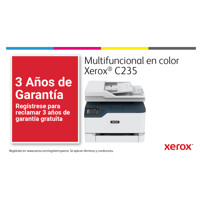 Imagen de la impresora multifuncional inalámbrica Xerox C235 con capacidad de 22 ppm, incluyendo funciones de copia, impresión, escaneado y fax. SKU: C235V_DNI.