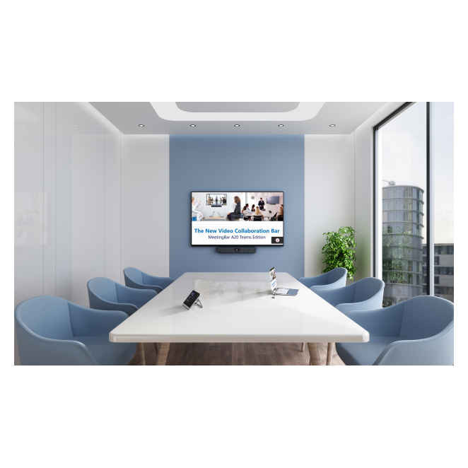La Yealink MeetingBar A20 junto al CTP18 Collaboration Touch Panel y el VCH51 Sharing Box ofrece múltiples beneficios. La cámara de 20 MP garantiza vídeos nítidos y de alta resolución, mientras que el sistema de reducción de ruido y la cancelación de eco aseguran que las voces se escuchen claramente. Su diseño todo en uno, que incluye altavoces incorporados y micrófonos de alta calidad, aporta una solución compacta y eficiente a cualquier sala de juntas.