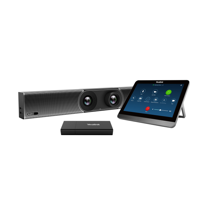 El paquete incluye la barra de colaboración de vídeo Yealink MeetingBar A30, el mando a distancia VCR20, el control táctil CTP18, y el concentrador VCH51.