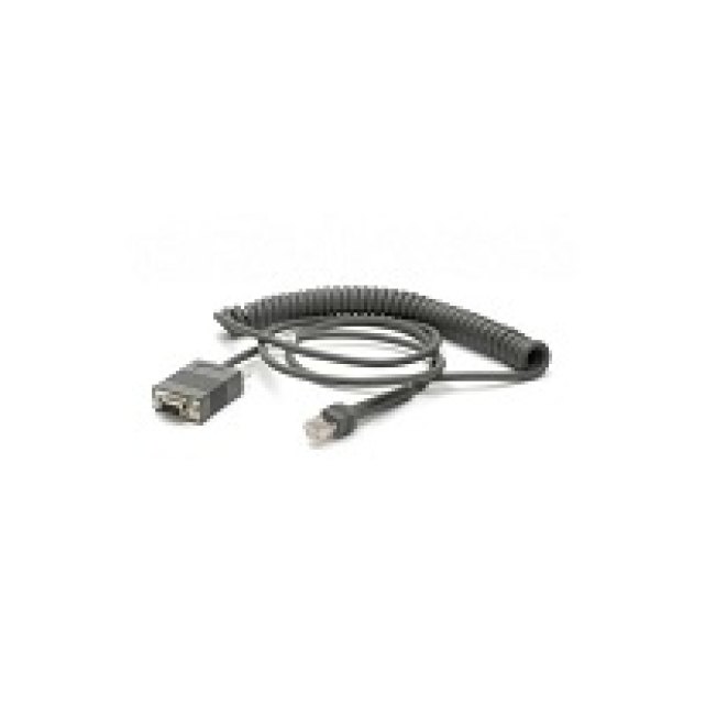 Imagen del cable de serie Zebra modelo CBA-RF2-C09ZAR, de color negro, longitud 2.8 metros, con conector RS232 DB9.