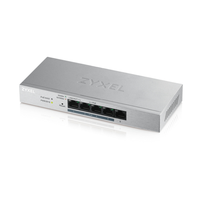 Imagen del switch gestionado Zyxel GS1200-5HP v2 con cinco puertos Gigabit Ethernet, soporte PoE y diseño en color gris. SKU: GS1200-5HPV2-EU0101F