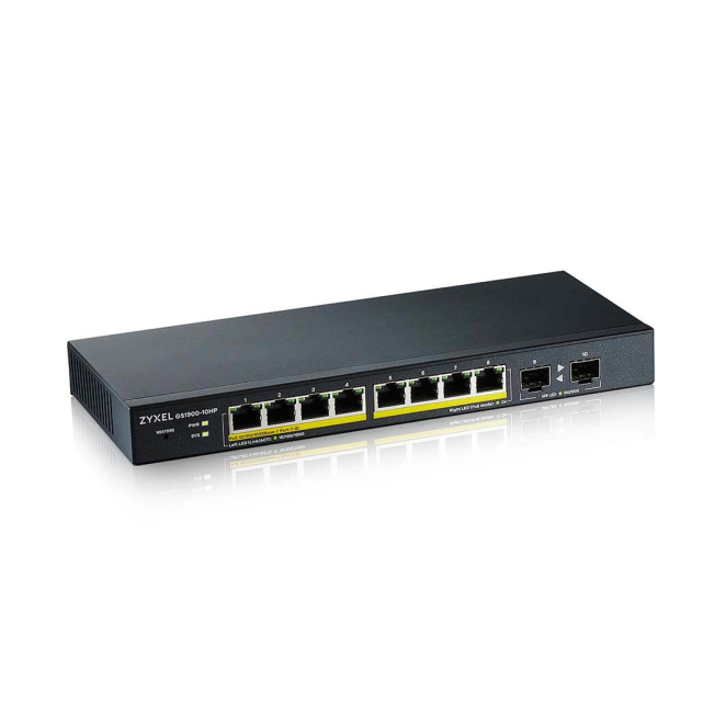 Imagen del Zyxel GS1900-10HP, un switch gestionado de nivel 2 con 10 puertos Gigabit Ethernet y capacidad PoE, SKU GS1900-10HP-EU0102F